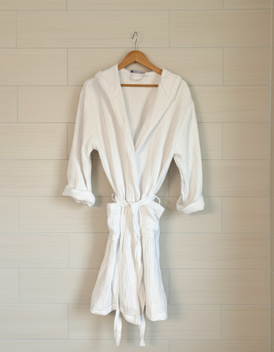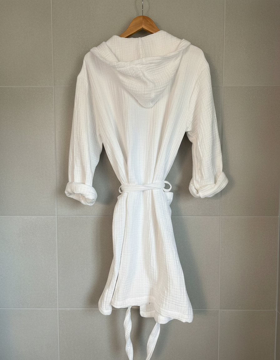 Experience true comfort and luxury with our muslin robes. Crafted from premium Turkish cotton for absorbency and a soft, light weight feel. Detailed with a waist tie, two pockets and a cute hood. Perfect for post-shower relaxation or a spa-like experience.