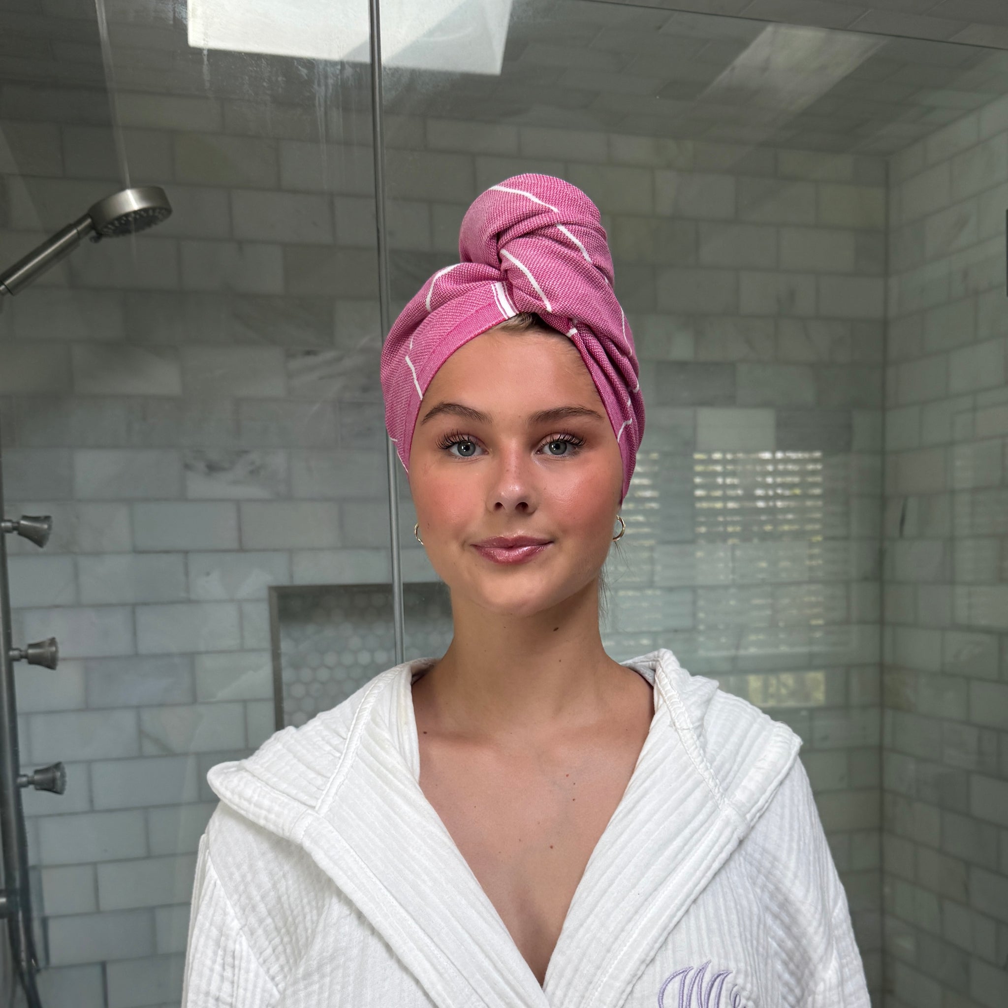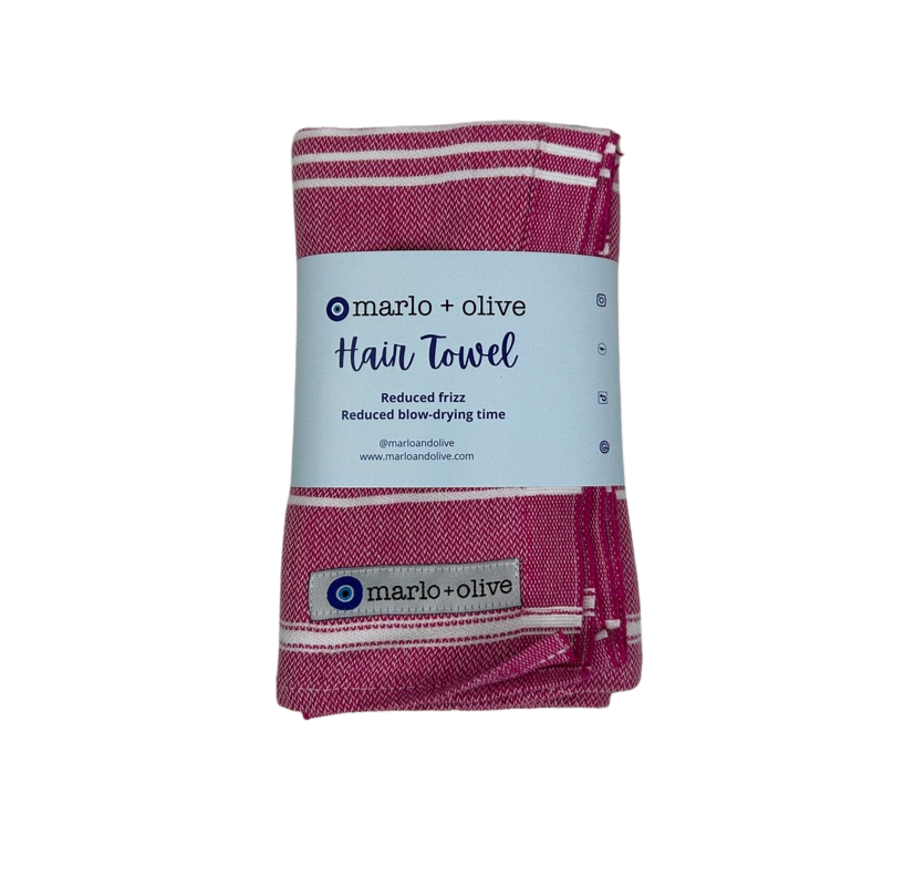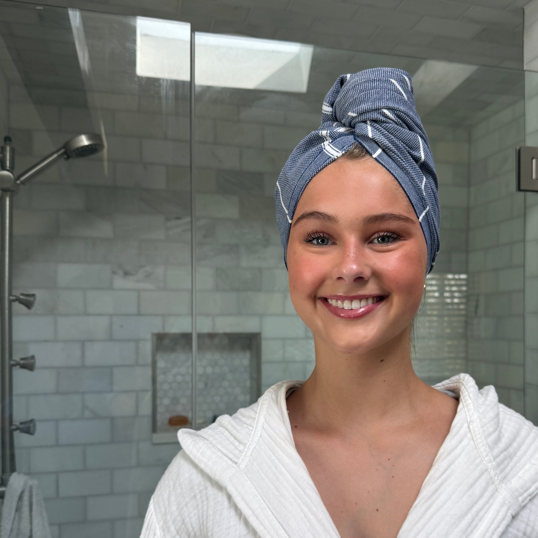 What makes our hair towel so great you ask? Well, we use only the highest quality Turkish cotton. The cotton is loomed using a long flat weave. This matters for a few reasons. Turkish cotton is known world wide for its softness and absorbency - so this small towel, will absorb and pull the moisture from your hair. The long flat weave reduces frizz because there is nothing to cause friction on your hair shaft, unlike a traditional looped terry towel.